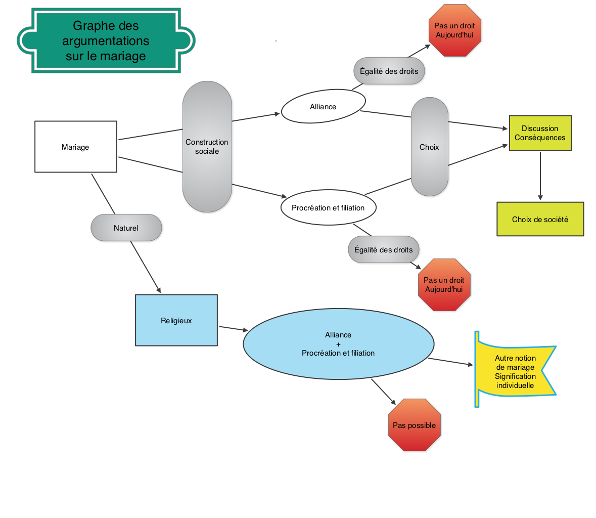 Très simplement, et contrairement à la réalité d’une définition mathématique, je peux modifier la définition du mariage, construction culturelle humaine, en l’étendant aux personnes du même sexe. Et le droit vient avec. Cela paraît peut-être un peu tortueux comme raisonnement, mais cela fait ressortir le principal : la définition du mariage est un choix humain, nous en sommes responsables et pouvons le changer. On n’a pas besoin d’invoquer un droit pour l’étendre, il suffit de le modifier pour étendre le droit.